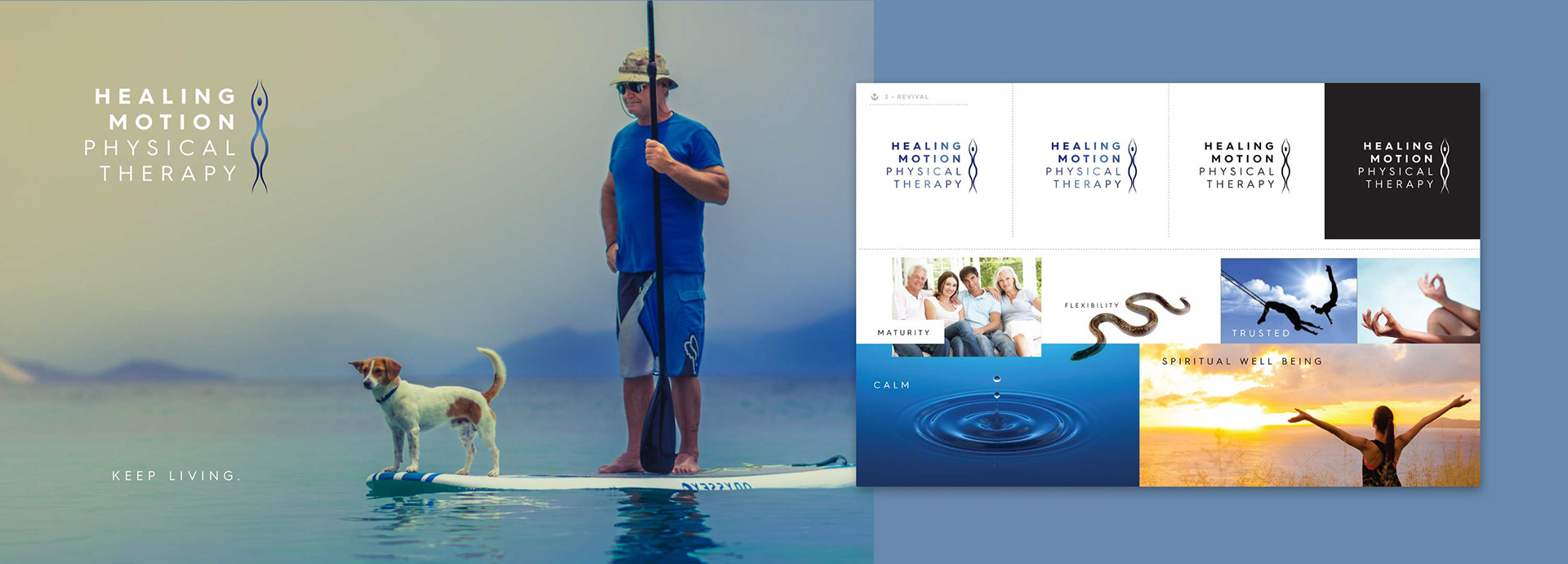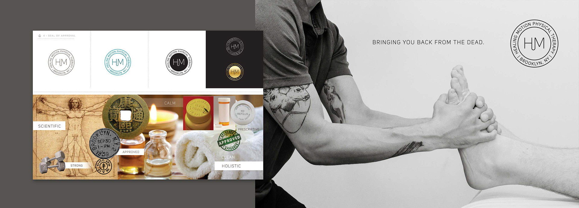Logo Design for Physical Therapist who - from experience, brings people back from the dead. Showing 'Seal of Approval' chosen design with alternate initial exploratories.